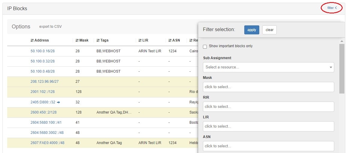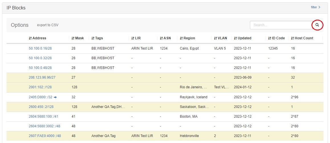 View, search, filter, and sort Assigned Blocks for the resource via the "IP Blocks" list: