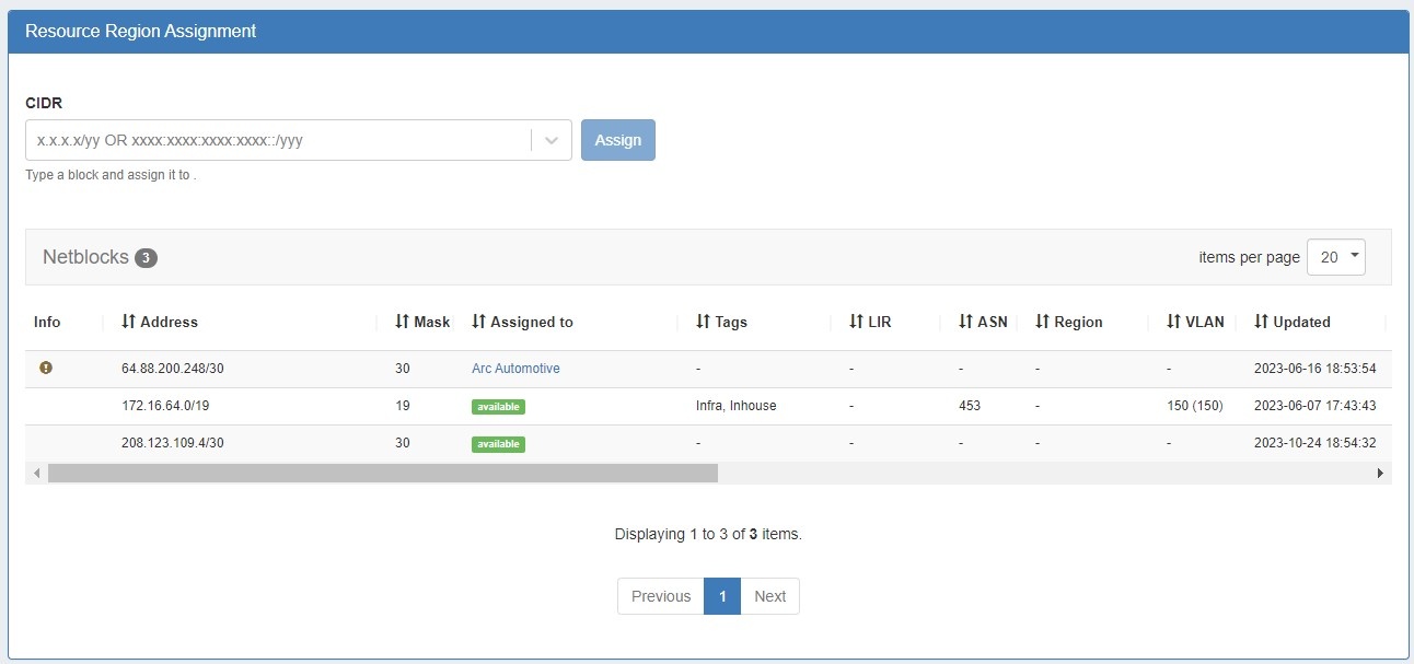 For more information on assigning and managing blocks, see Working with IP Blocks - Assigning IP Space.
