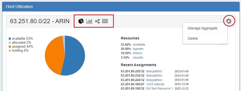 Provides utilization data and a shortcut link to the IPAM Manage screen for that aggregate if in "Aggregates" view, or assignment details if in "Recent Assignments" view.