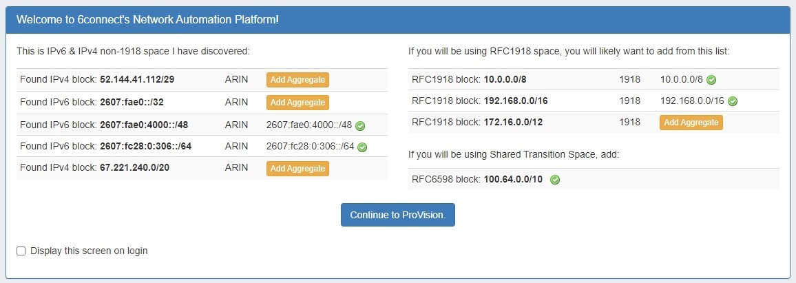 Importing blocks from your RIR source IP is available from the Data Import Tab in the Admin area of ProVision. This feature uses the RIR Org ID to identify a source IP and determine blocks assigned to your organization that are available for import.