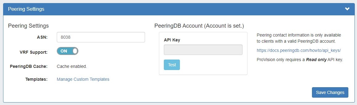To set a PeeringDB Account, go to Admin Settings → Peering, and enter the Read Only PeeringDB API key. Click "Test" to verify the connection.