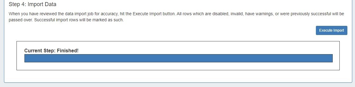 When the bar reaches 100%, and displays "Current Step: Finished!" the import is complete, and you may leave the page.