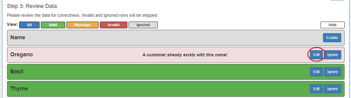For rows with an "Invalid" or "Warning" status, you may wish to edit the record to change information to a valid option.