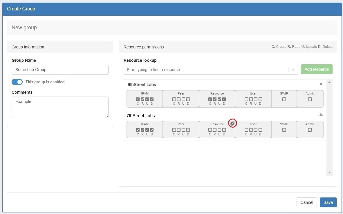 Here, we show making a group called "Some Lab Group", whose users we want to be able to access two resources: 6thStreet Labs and 7thStreet Labs.