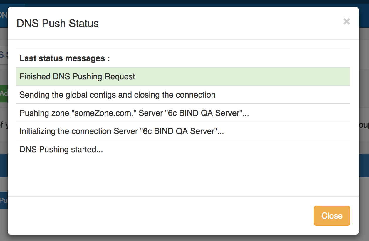 The "Push Status" modal will appear, showing status and any errors that occur. When a successful zone push is complete, a green "Finished DNS Pushing Request" message will appear, and the window may be closed.