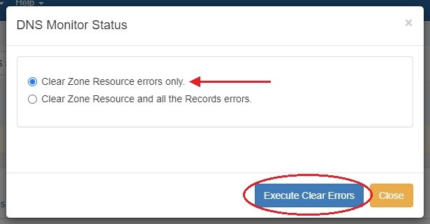 You may clear the error if desired, recheck, or close the box. Clicking the "Clear Errors" button allows you to choose whether to clear the zone error only or the zone error and any errors in records in the zone.