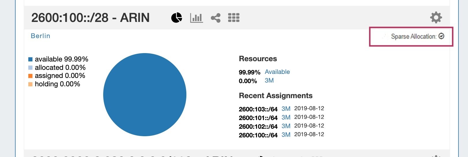Sparse allocation options are accessed from the IPv6 Aggregate's Action Menu (gear icon). The top right corner of the Utilization module for the IPv6 aggregate will display whether sparse allocation is enabled or disabled for the particular aggregate.