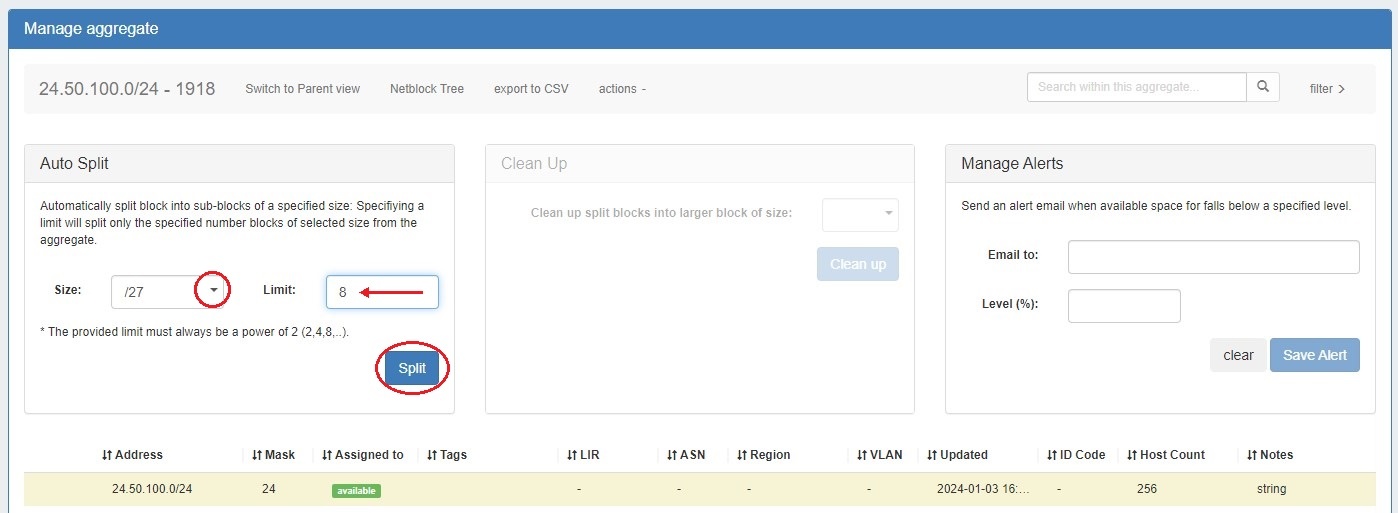 From IPAM Manage, you can perform the aggregate template actions of Auto-Split / Clean-Up, Set IPAM Alert information, export the block list, as well as manage individual blocks.