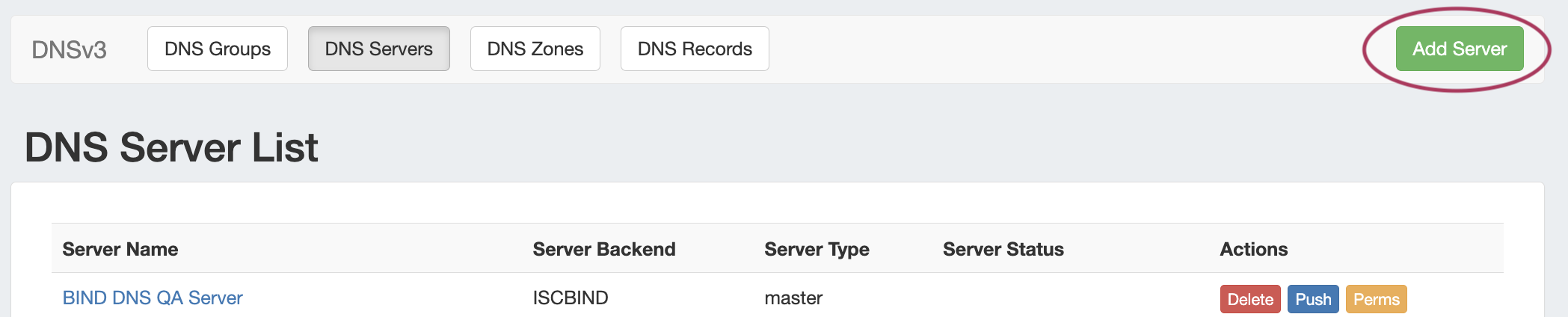 To create a new server, start from the DNS Tab, select the DNS Servers sub menu. Then, click the "Add Server" button next to "DNS Server List".