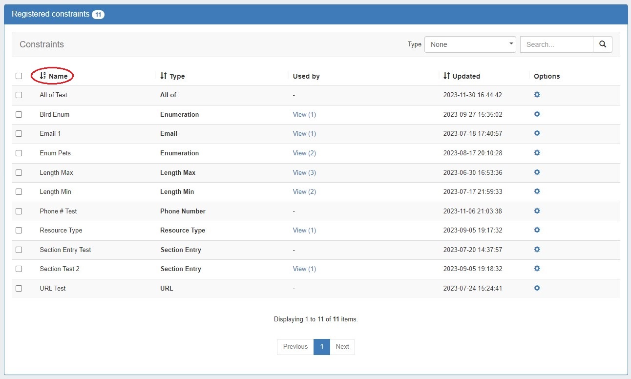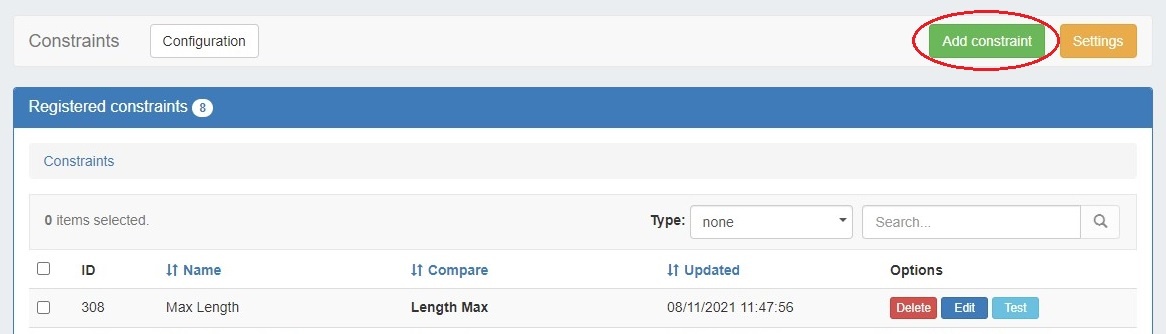 The Constraints List displays all registered constraints and is where you can view, edit, test, and delete existing constraints.