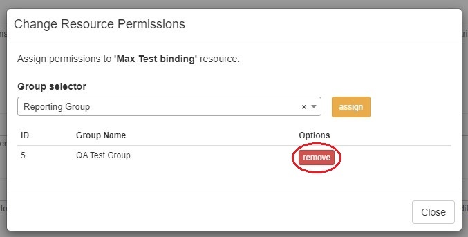Selecting "Change Binding Permissions" opens the "Change Permissions" dialog box where you can select a group(s) to assign the constraint to. The groups assigned to a constraint are listed below the group selector.