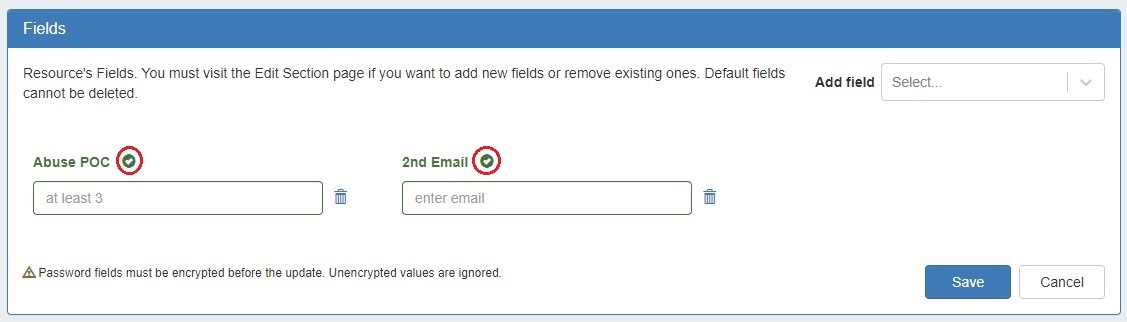When a field is viewed in IPAM Manage that has a constraint applied, a "check" icon will display next to the field input for simple input constraint checks, if empty values are allowed.