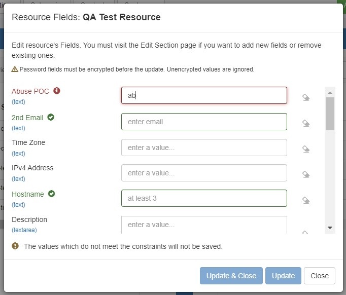 A constrained field is available to edit from the Resource List Edit Fields modal and the Resource's Fields Gadget.
