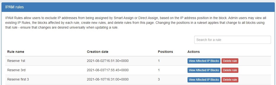In the IPAM Admin "Edit IPAM Rules" section, Admin users may view all existing IPAM Rules, the blocks affected by each rule, and delete rules.
