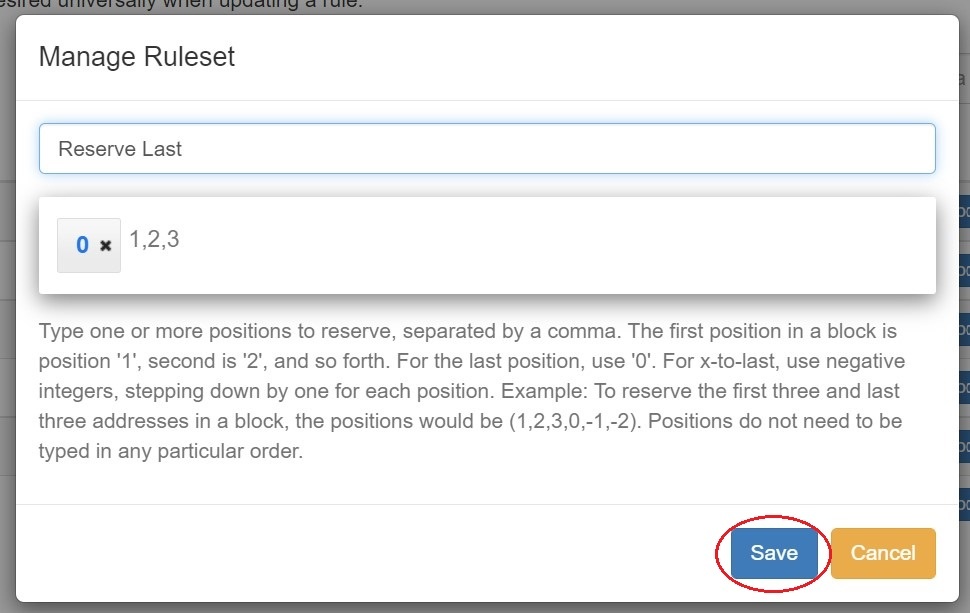 Reserved addresses are set by their position in the block, starting with position '1' to represent the first address, '2' the second, and so on (1,2,3). The last position in the block is represented as '0', with each step backwards set as the next lowest negative integer (0, -1, -2, 3). Rulesets may reserve one or many positions in a block, so you can choose to reserve only the first address (1), only the last address (0), or combinations as desired - reserving the first three and last three addresses on a block would look like (1,2,3,0,1,-2).