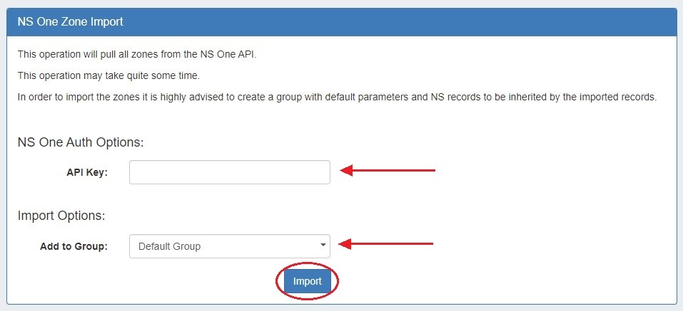 Then, enter the NS One API key and the DNS Group to add the zones to.