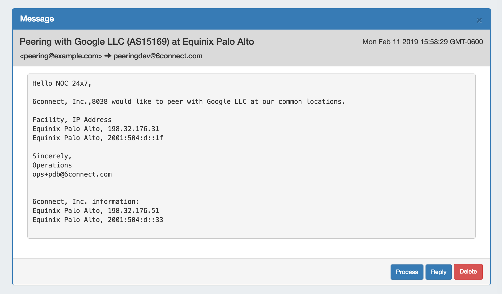 Sent: Emails sent from the set address from ProVision, either via "Reply" or from sending a peering request under "Exchange Details" → Communications