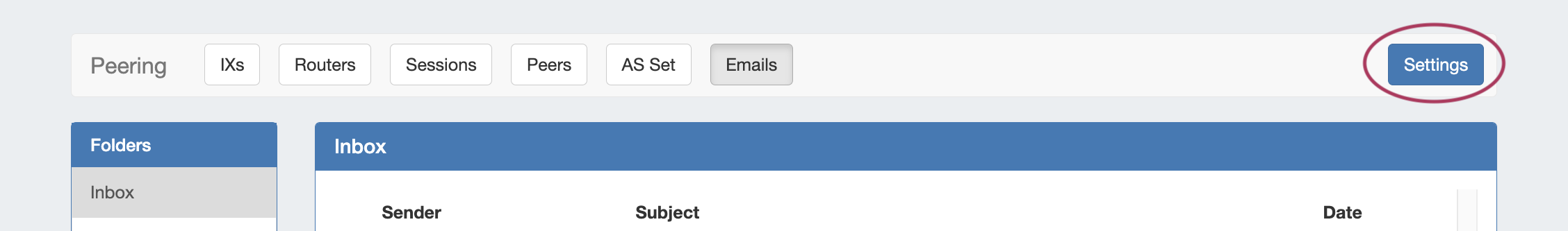 The Peering Emails subtab is an Admin-only page from which a company peering account can view and manage recent emails.