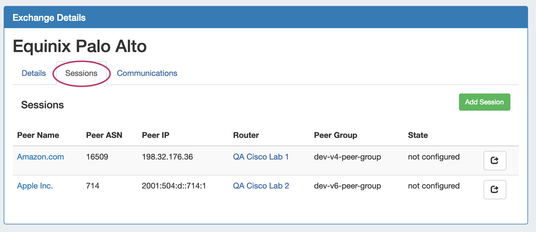 Clicking on the name of any peer in the under the "Peers at this Exchange Point" list will open the Peer Details page.