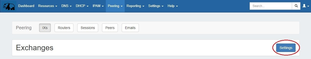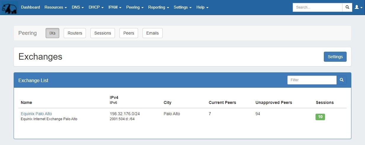 From this tab, you can access exchange settings to set ASN / Peering DB info, view the current exchange list and peer status, and view details for each exchange.