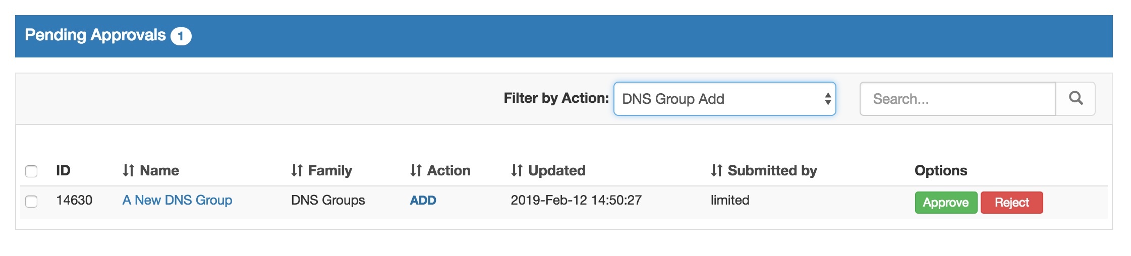 The Approvals module stores and queues DNS or DHCP actions made by selected User Groups, and sends those actions to a Pending Changes list for administrative review.  Later, an administrator (or combination of administrators) can approve or reject these stored actions.