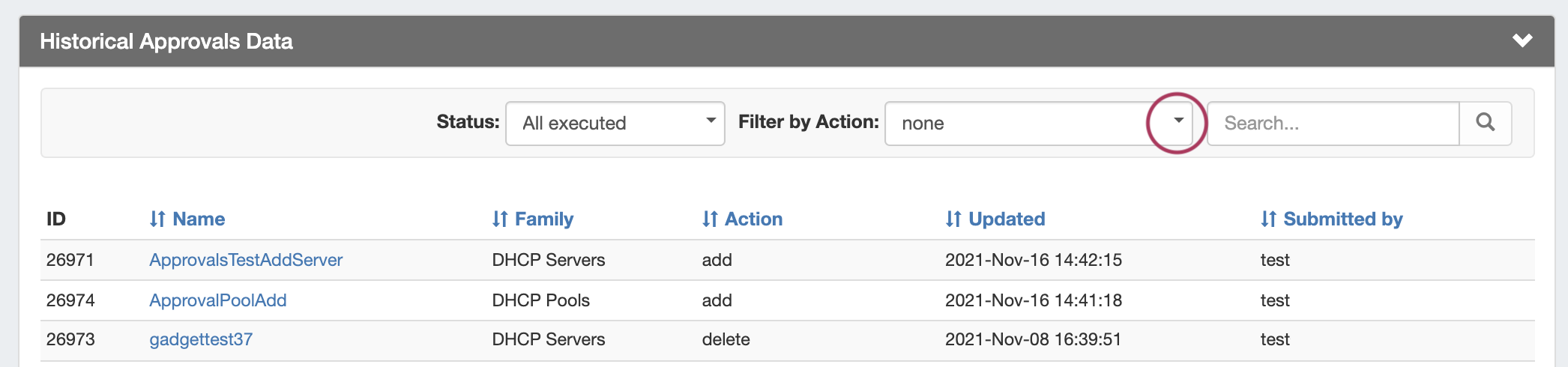 Similar to the Pending Approvals list, it may be sorted ascending / descending by field,  filtered by status, filtered by action, or searched by name.