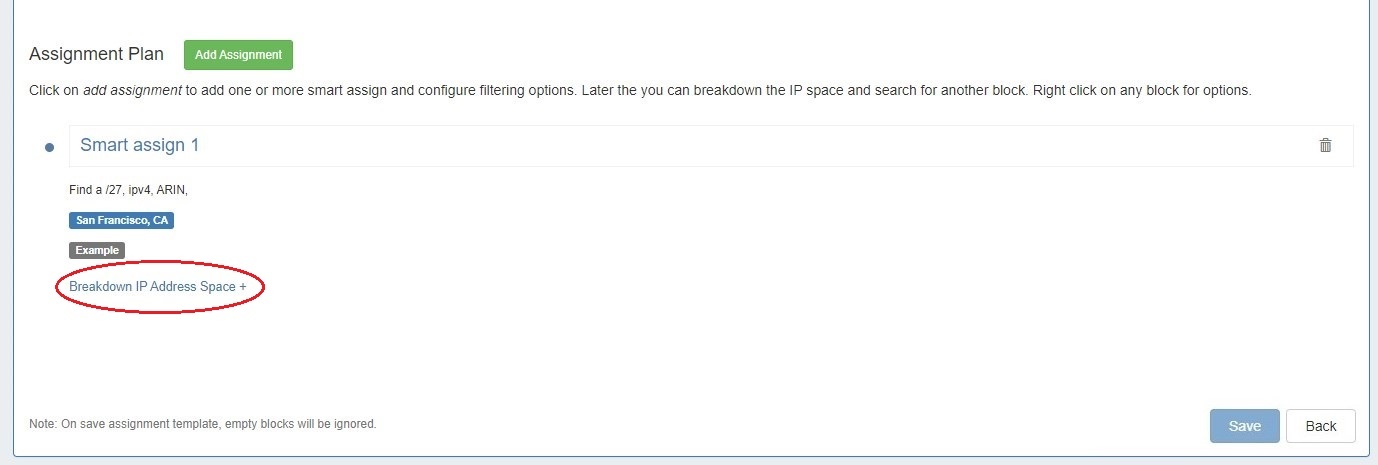 Like Smart Assign, Smart Assign Templates allow you to enter criteria such as IP type, size, RIR, region, and tag information to automatically assign a block meeting that criteria, if any exist. But Smart Assign Templates allows users to breakdown IP space even further through multiple levels of conditions for more complex assignments. For example, if you need a /24 from Resource A with Tag B, then want to take the first /28 of it and sub-assign that to Resource C, and then take the last /30 of it and assign it to Resource D - you can create a template to do just that.
