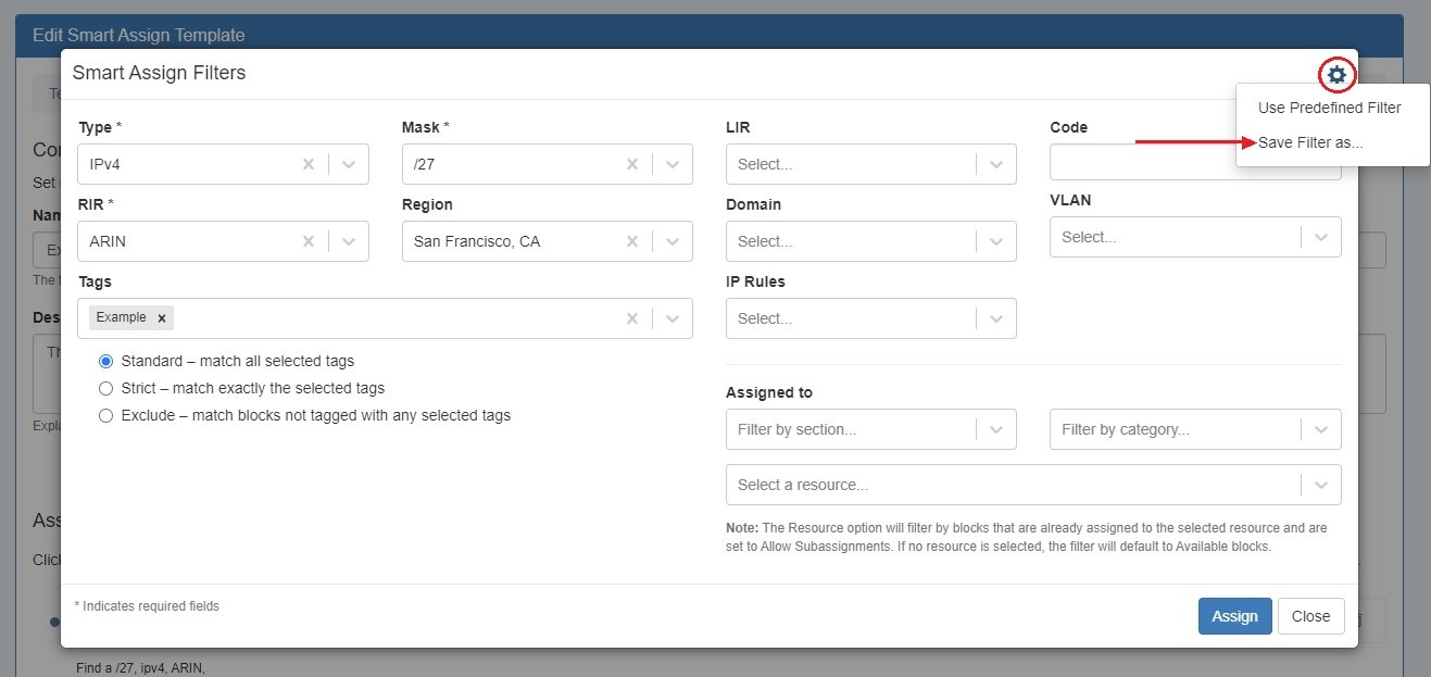 To create a Predefined Filter, select Smart Assign filter criteria. Click on the gear icon at upper right and select "Save filter as..."