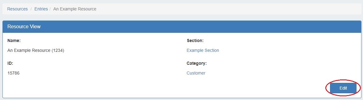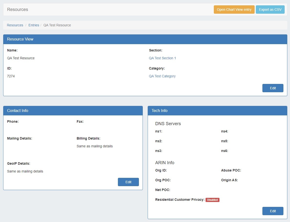 Open the page by clicking on a resource name from the Resource List, or select "View" from the Action Menu for the resource in the Entry List.