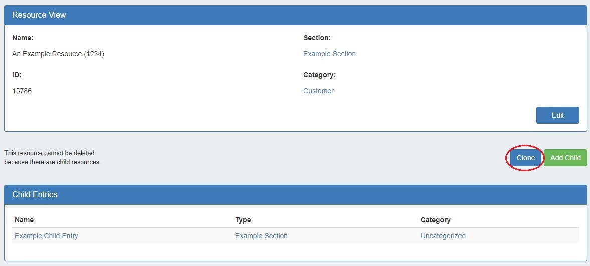This feature can be used to quickly and efficiently create multiple resources with same format, field information, or similar hierarchy structure. One example may be a datacenter with x number racks with y number of servers on each. One rack, with its servers as child entries could be created, and then cloned until the necessary quantity is reached. As text field information is copied during the clone, changes in individual server information would still need reviewed and updated. Think of cloning as creating a template from an existing resource entry.