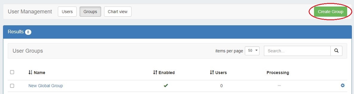 Select the "items per page" filter to limit the number of groups displayed at one time. Any additional users will be displayed on following pages.