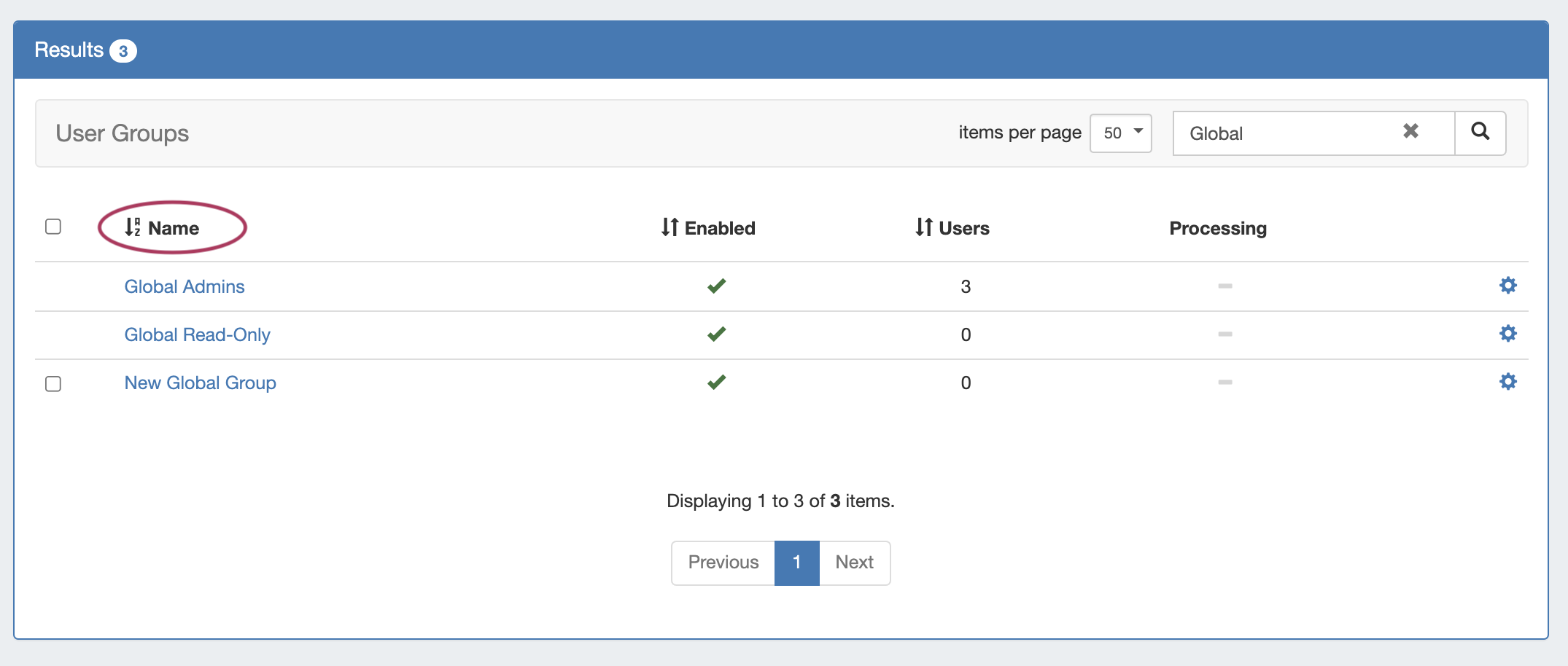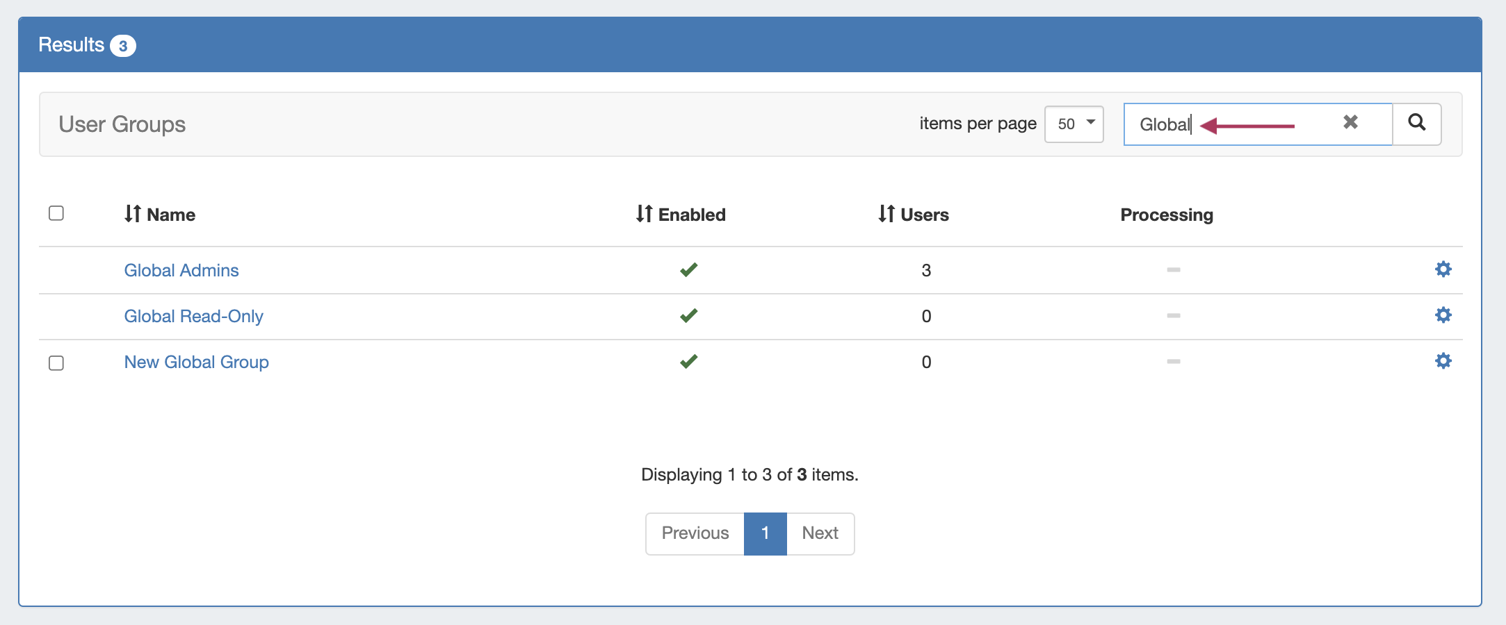 - Processing: While group edits are being processed, an indicator will show under the processing column until changes have been propagated throughout the instance