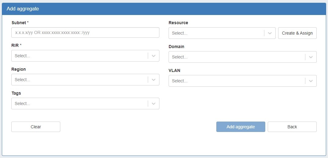 On the main IPAM Tab, click the "Add Aggregate" button. A new page will open to fill in details for a new aggregate block.