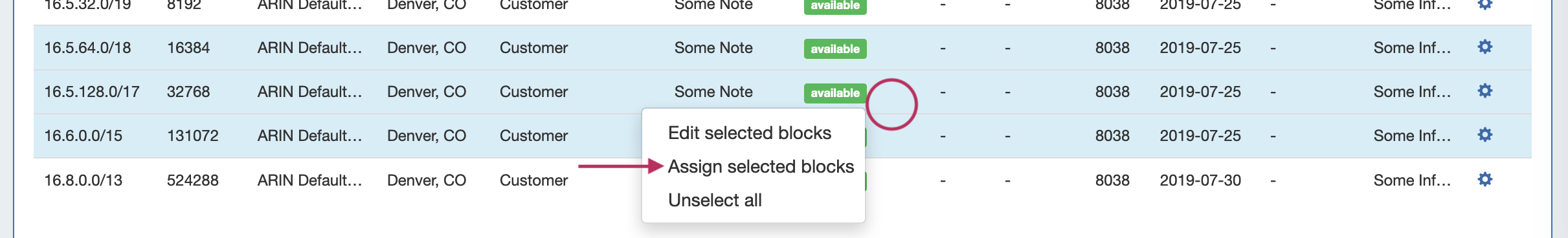 Assignments may also be performed for multiple blocks at a time, by shift-clicking the desired blocks, and right-clicking on any highlighted row to open the multi-block menu (choose "Assign Selected Blocks") :