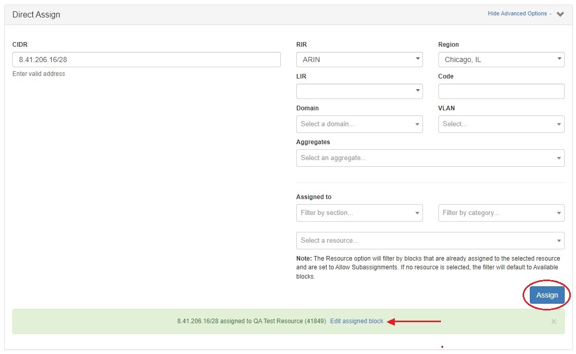 Direct Assign is used when you know the exact CIDR that you wish to assign to the Resource. You can use "Simple" direct assign, for straightforward assignments of a CIDR to the Resource, or "Advanced", used in cases where duplicate blocks may exist and you need additional criteria to differentiate between them.