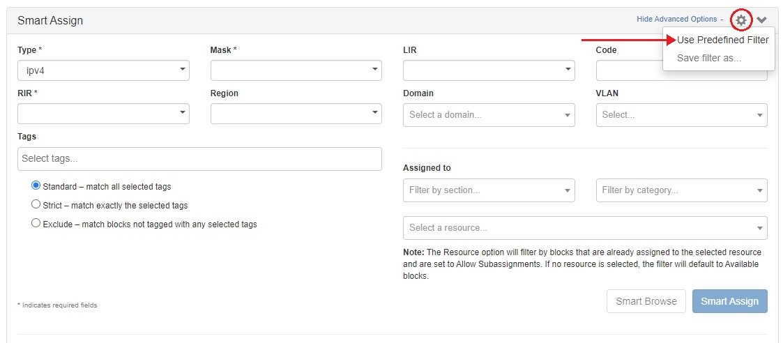With Smart Assign, you enter criteria such as IP Type, Size, RIR, Region, and Tag information, then ProVision's automation will automatically assign a block meeting that criteria, if any exist. Smart Browse uses the same criteria, but provides a browsable list of blocks meeting that criteria for you to select from. Users can also save commonly applied Smart Assign / Smart Browse filter criteria for repeat use as Predefined Filters.