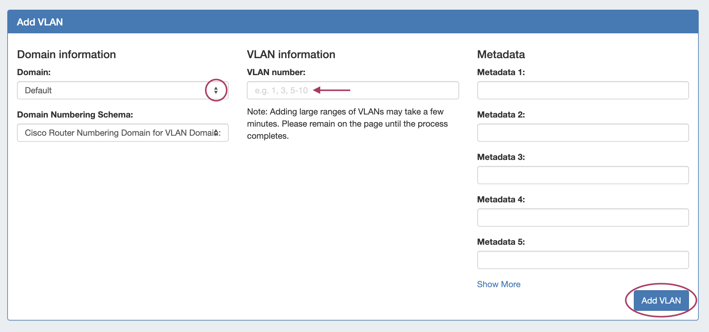 Select the domain, and then enter the individual or range of VLANs to add. Optionally, you may enter VLAN metadata field values, if metadata fields are enabled.