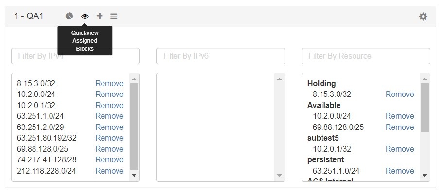 While in the Quickview panel, you may easily search for a block by typing the all or part of the CIDR into the IPv4 or IPv6 Filter boxes - useful for verifying an assignment or quickly scanning ranges.