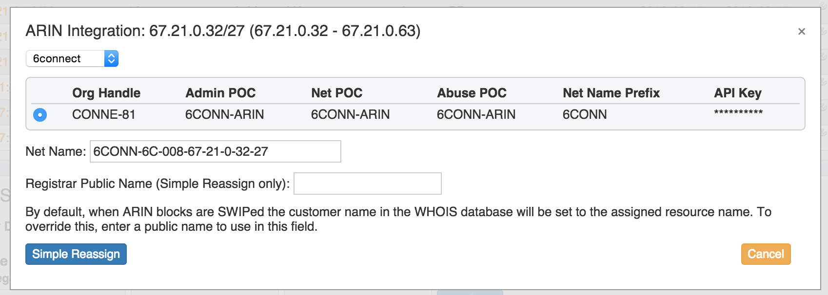 It will bring up an RIR Integration dialog, dependent on the selected RIR (ARIN example shown):