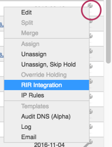 Select "RIR Integration" from the Action Menu in IPAM Manage.