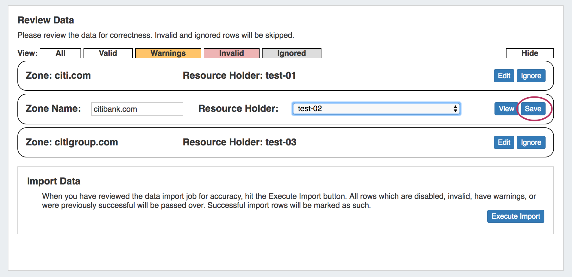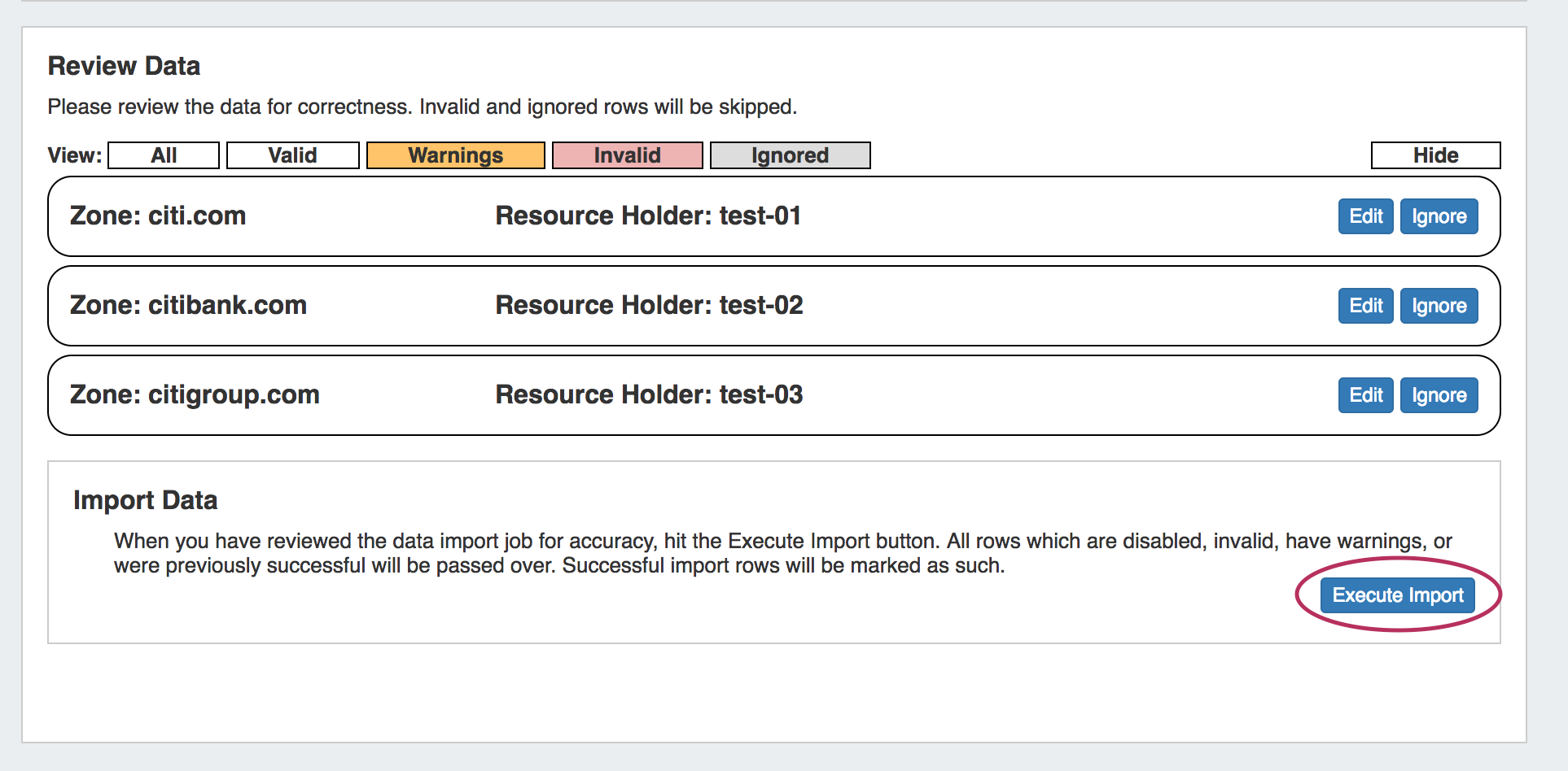 When the review step is completed, hit the "Execute Import" button. A progress bar will appear to show progress and note errors if they occur.