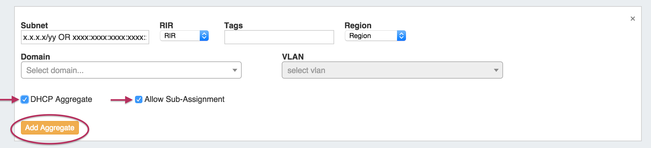 Fill in the aggregate information, and select the "DHCP Aggregate" checkbox option as outlined below. "Allow Sub-Assignment" will be selected automatically,so that smaller blocks may be assigned to DHCP pools.