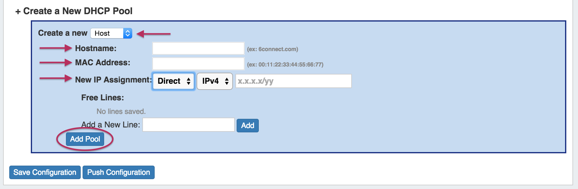 For Direct Assign: select IPv4 / IPv6 and enter the block in CIDR format, add free lines if desired, then click "Add Pool".
