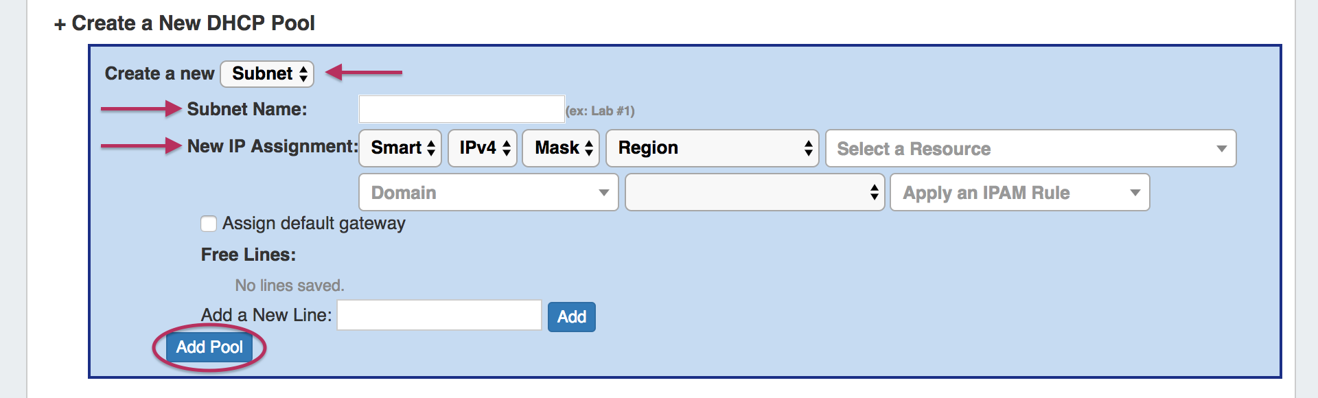When Assigning a Subnet (via dropdown) the IP Assignment selection will pull the data from the DHCP Available blocks that you defined earlier. You can use either a Smart or Direct assignment depending on your preference. For Smart Assign pool creation, existing IP Rules may be applied to reserve additional addresses out of the pool range. To create an IP Rule, see (6.1.0-6.1.2) IPAM Rules.