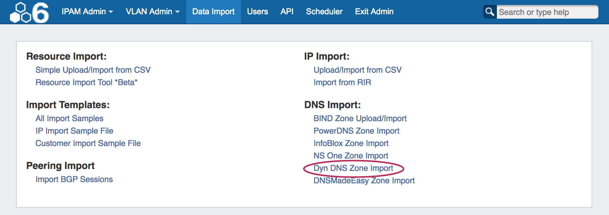 Once server setup has been verified, navigate to the Data Import Tab in the Admin section. Select the "Dyn DNS Zone Import" link.
