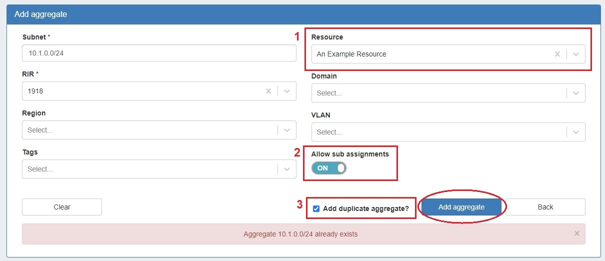 When managing duplicate/overlapping IP ranges within ProVision, there are several methods you can use to ensure that blocks are "unique" and still leverage functions like Smart Assign. The easiest approach is to use metadata for the aggregate (LIR, Region, Resource, etc.). From the ProVision GUI, you can use the "Add Aggregate" function on the IPAM tab (image below) to add a duplicate aggregate. By assigning the new Aggregate to a Resource (#1) you will tie the block and a Resource together. You most likely wish to make assignments out of this new aggregate, so you can enable subassignments (#2) before adding the aggregate (#3).