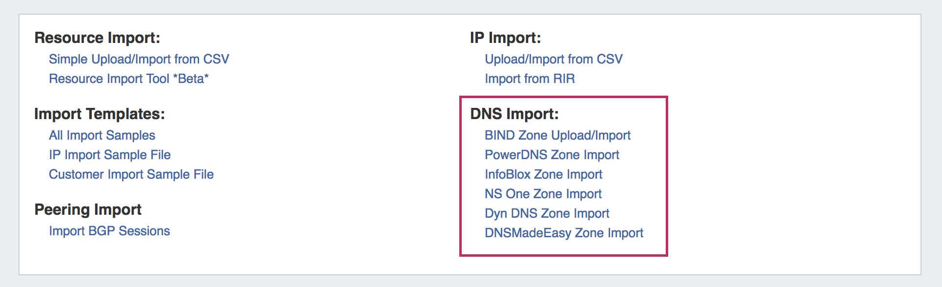 ProVision offers three DNS zone import options, available under the Data Import tab in the the Admin section of ProVision: