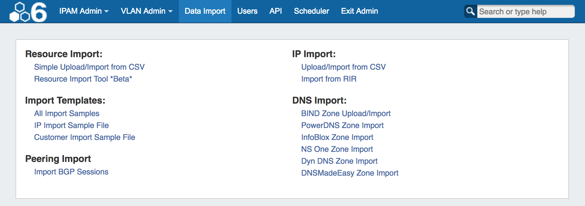 BIND Zone Upload / Import: Imports DNS zones using the named.conf configuration file tied to the zones you are uploading, a .zip or .tar file of the zones themselves, and an optional .csv file mapping zones to customers and DNS Servers. This is the simplest and most commonly used import method. Refer to (6.1.0-6.1.2) Import DNS Zones for more information.