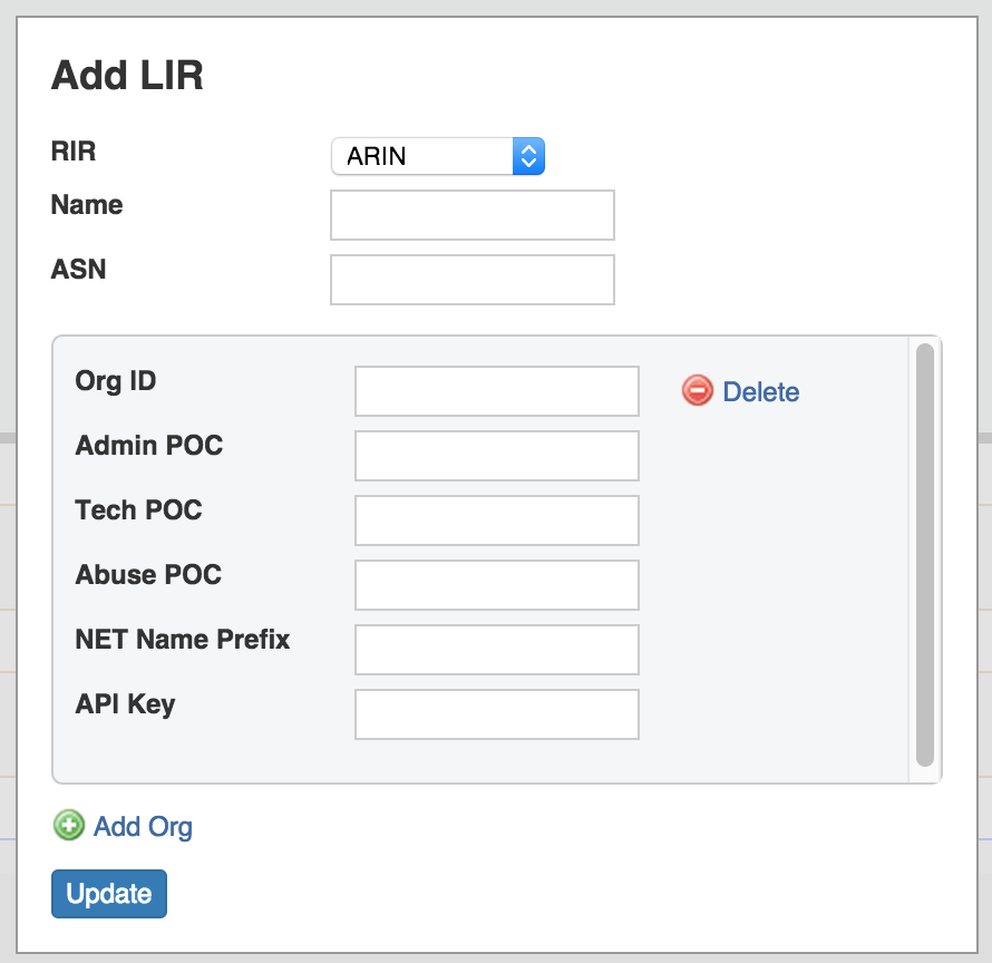 Adding a new LIR with ARIN selected for RIR will bring up the following fields.