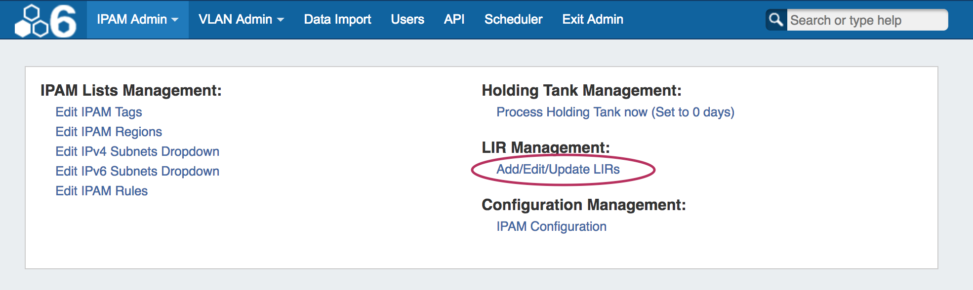 There is an LIR Manager available from the IPAM Admin page. In the Admin section of ProVision, select the IPAM Admin tab, then "LIR Management: Add / Edit / Update LIRs".